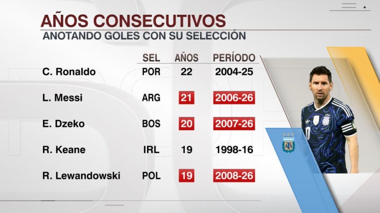 据ESPN数据统计,梅西已经连续21年在代表国家队出战时至少打进1球,他也超越了波黑中锋哲科的连续20年,排在第二位。
