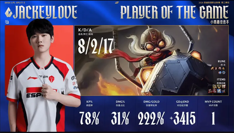 JackeyLove首局发挥出色,斩获TES对阵WE首局MVP