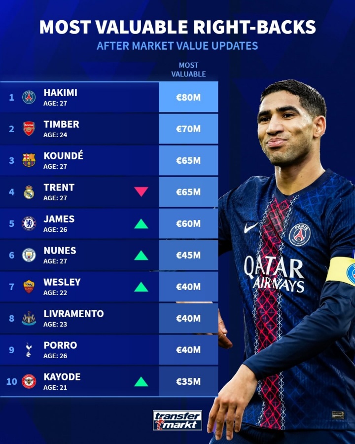开云体育下载-最新足坛右后卫身价排行榜:阿什拉夫8000万欧元最高,廷伯排第二