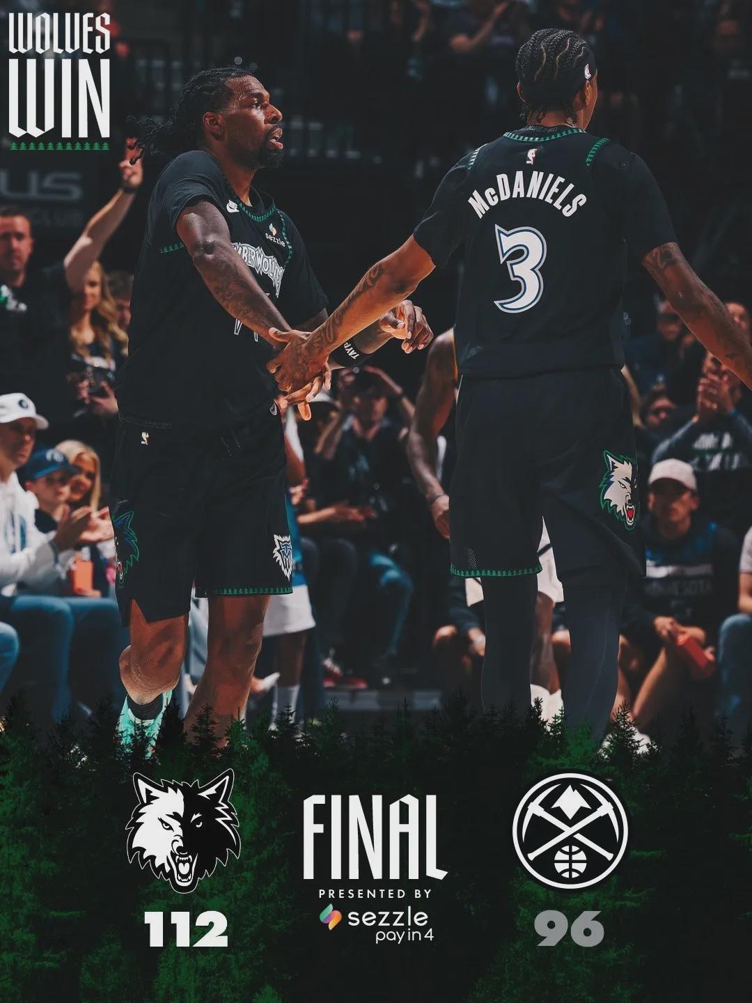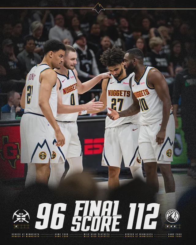 迪温琴佐和爱德华兹伤退,大家以为森林狼会输掉这场比赛,没想到他们用一场大胜夺得系列赛赛点。四节比分(掘金在前):23-22、31-28、24-32、18-30。森林狼拿出高强度防守,整个下半场,掘金全队加起来只得到42分!