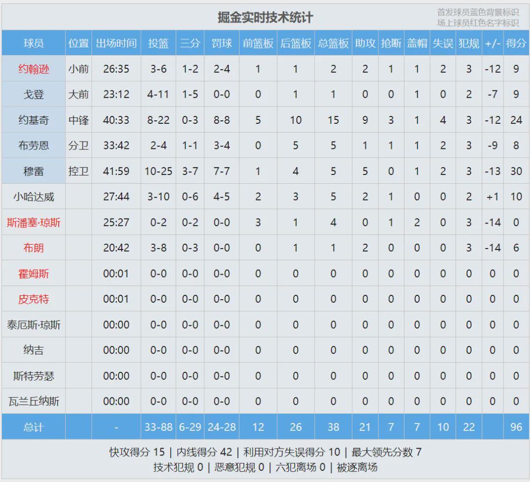 此役约基奇投篮22中8,三分3中0,罚球8中8,拿到24分15板9助3断1帽4失误,正负值-12。最近3场,约基奇投篮命中率33.8%,三分命中率只有15%。从G2到G4,戈贝尔在第四节一共防守约基奇21分钟,后者投篮合计16中2!